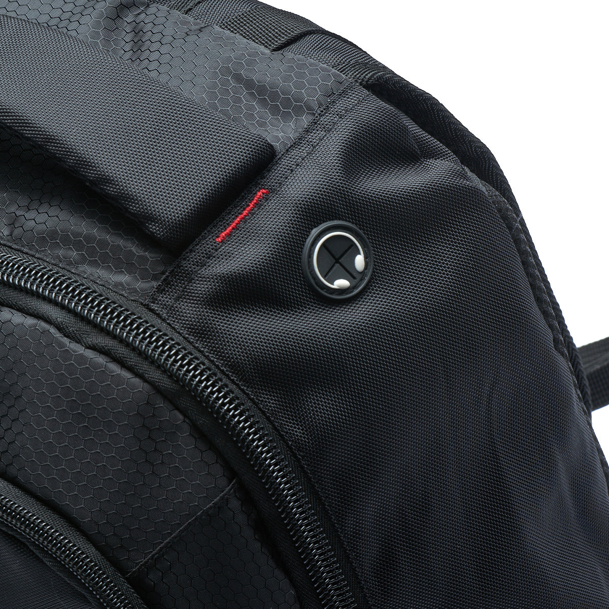 ON THE UPPER OF THE BAG THERE IS AN OPENING FOR WIRES OF YOUR DEVICES.