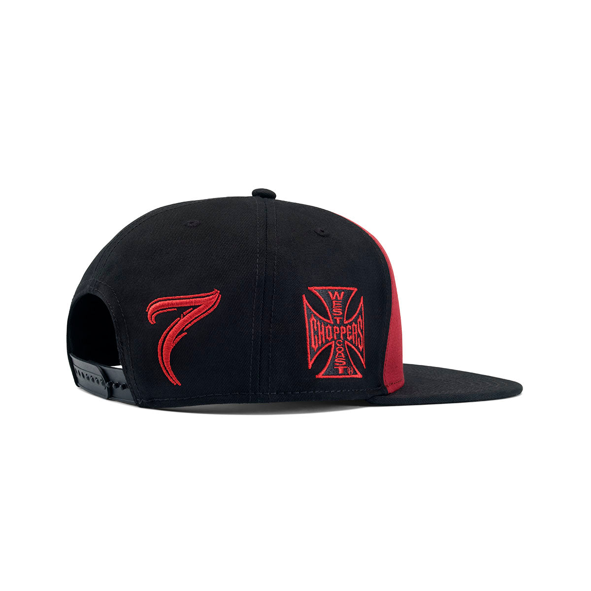 RED/BLACK FLATBILL HAT WITH WITH KIMI AND HIS NUMBER 7 IN SCRIPT LOGO ON THE LEFT FRONT PANEL IN 3D. THE HAT HAS A BLACK FLAT BILL, AT THE LEFT SIDE IT HAS A FAKE LEATHER BADGE WHERE THE SCRIPT LOGO IS EMBOSSED. AT THE RIGHT SIDE THE WEST COAST CHOPPERS LOGO IS EMBROIDERED. AT THE LEFT BACK PANEL KIMI'S NUMBER 7 IS EMBROIDERED IN RED.