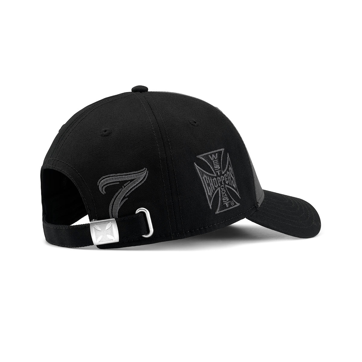 CHARCOAL/BLACK ROUNDBILL HAT WITH WITH KIMI AND HIS NUMBER 7 IN SCRIPT LOGO ON THE LEFT FRONT PANEL IN 3D. THE HAT HAS A BLACK ROUNDED BILL, AT THE LEFT SIDE IT HAS A FAKE LEATHER BADGE WHERE THE SCRIPT LOGO IS EMBOSSED. AT THE RIGHT SIDE THE WEST COAST CHOPPERS LOGO IS EMBROIDERED. AT THE LEFT BACK PANEL KIMI'S NUMBER 7 IS EMBROIDERED IN GREY. THE BUCKLE HAS A CROSS LOGO EMBOSSED.