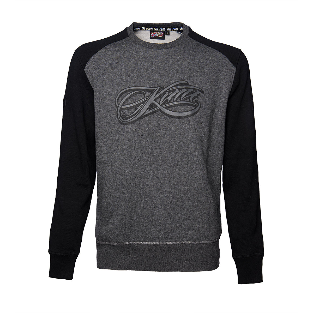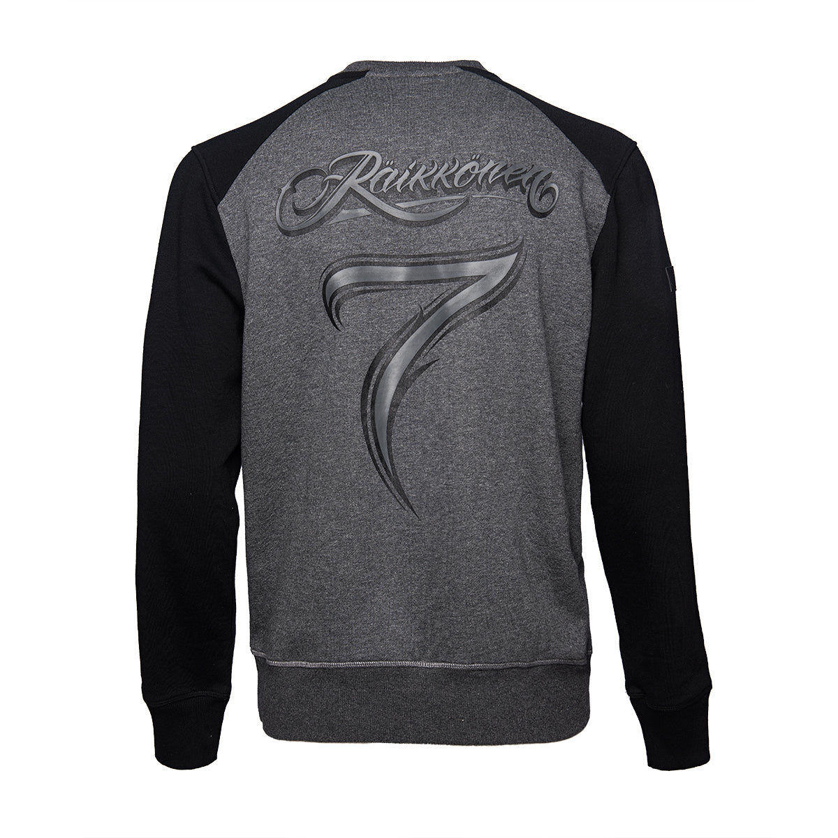 Raglan sleeved sweatshirt of 80% cotton and 20% polyester fabric. Kimi's logos are high density prints on front and back. On the right sleeve a fake leather badge is placed and a rubber badge appears at lower front, featuring Kimi's number and signature.