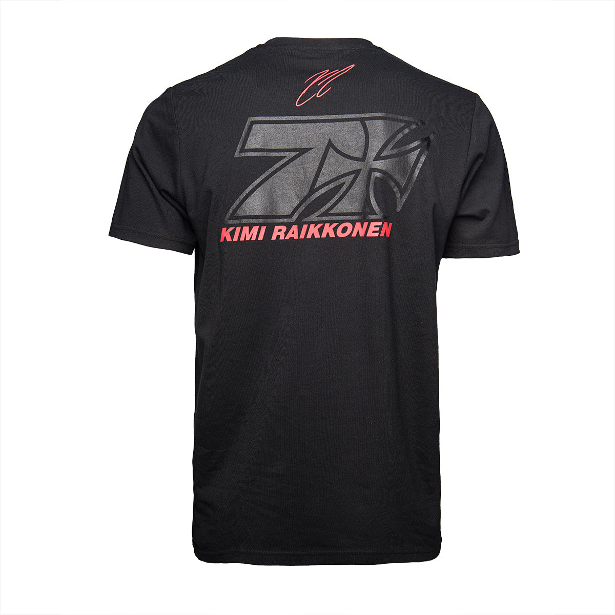 Black signature shirt, featuring Kimi's cross seven logo, embracing freedom, passion and style. Kimi's name and signature come in a 3d print to stand out. The grey cross seven is a pigment print. The shirts are made out of 100% cotton 165 gr/m².